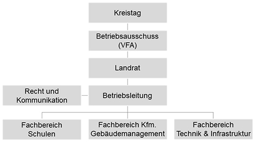 Der Eigenbetrieb gliedert sich in die Fachbereiche „Technik und Infrastruktur“, „Kaufmännisches Gebäudemanagement“, „Koordination Schulen“ sowie „Recht, Kliniken und Kommunikation“
