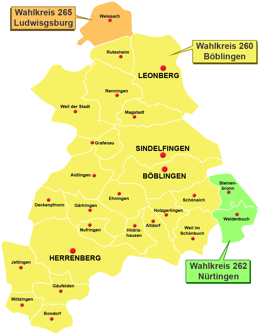 Zum Wahlkreis 260 Böblingen gehören: Aidlingen, Altdorf, Böblingen, Bondorf, Deckenpfronn, Ehningen, Gärtringen, Gäufelden, Grafenau, Herrenberg, Hildrizhausen, Holzgerlingen, Jettingen, Leonberg, Magstadt, Mötzingen, Nufringen, Renningen, Rutesheim, Schönaich, Sindelfingen, Weil der Stadt, Weil im Schönbuch