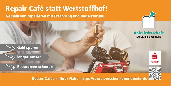 Wie das Repair Café Böblingen-Sindelfingen und die offene Werkstatt e. V. auf den beiden Böblinger Wertstoffhöfen setzen die Repair Cafés Renningen und Waldenbuch auf den örtlichen Höfen mit Infoständen und Reparaturbeispielen ein starkes Zeichen für nachhaltiges Denken und Handeln. Alle Interessierten sind herzlich eingeladen vorbeizuschauen. Die Reparatur-Initiativen möchten mit versierten Helfern reparaturfähigen Gegenständen ein zweites Leben schenken und damit gleichzeitig weniger Müll produzieren. Sie sind mit Adresse und Öffnungszeiten auf der Webseite ReUse & Repair des Abfallwirtschaftsbetriebs zu finden.