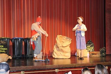Die Theatergruppe „forschperspektive“ spielt das Theaterstück „Halt! Das brauch ich noch.“. Mit diesem besonderen pädagogischen Projekt bietet der AWB an, abfallrelevante Themen auf eine ganz andere Art und Weise zu begreifen: Mit musikalischen Einlagen versehen erklärt die Theatergruppe spielerisch, wie man Abfälle richtig trennt und entsorgt, vor allem aber entwickelt sie kreative Ideen zum Weiterverwenden und Upcyceln von ausgedienten Gegenständen.