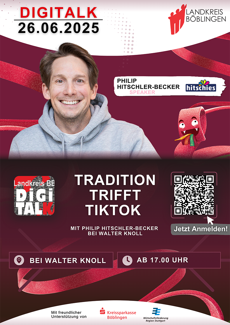 Sind Sie bereit für die digitale Zukunft? Dann verpassen Sie nicht den DigiTalk 2025 mit Philip Hitschler-Becker, dem Geschäftsführer von hitschler International, am 26. Juni 2025 bei Walter Knoll in Herrenberg! Erfahren Sie, wie Sie Social Media als strategisches Werkzeug für den Erfolg nutzen und erhalten Sie praxisnahe Einblicke in ein traditionsreiches Familienunternehmen mit moderner Denkweise.