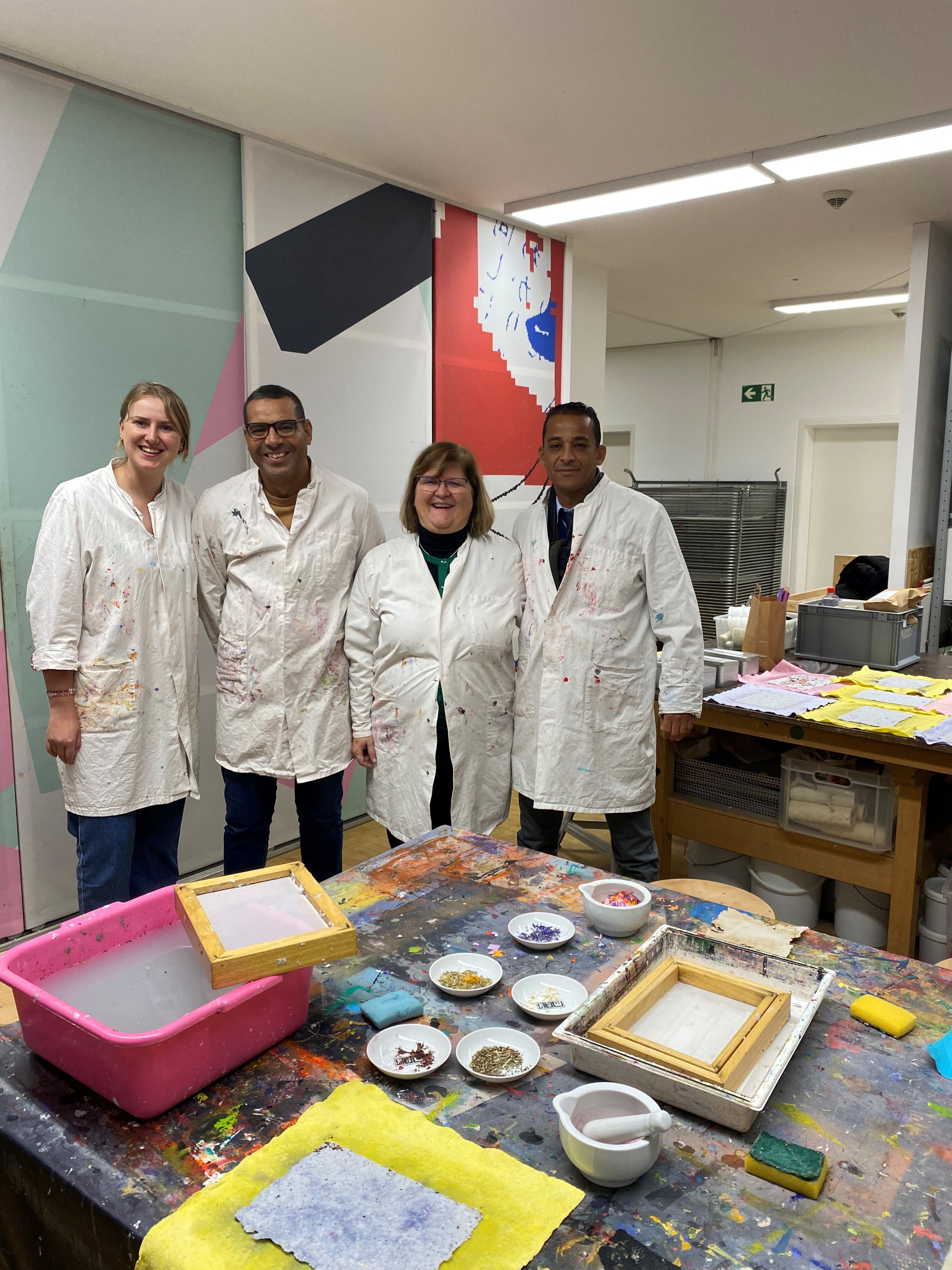 Vor dem offiziellen Start der Konferenz fanden am 11. und 12. November bereits Arbeitsgespräche zu den Projekten der Partnerschaft statt. Um kreative Impulse zu setzen und zentrale Themen wie Abfallvermeidung, Recycling und Kunst auf inspirierende Weise zu verbinden, besuchten die Teilnehmenden einen Papierschöpf-Workshop im Museum für angewandte Kunst in Frankfurt.