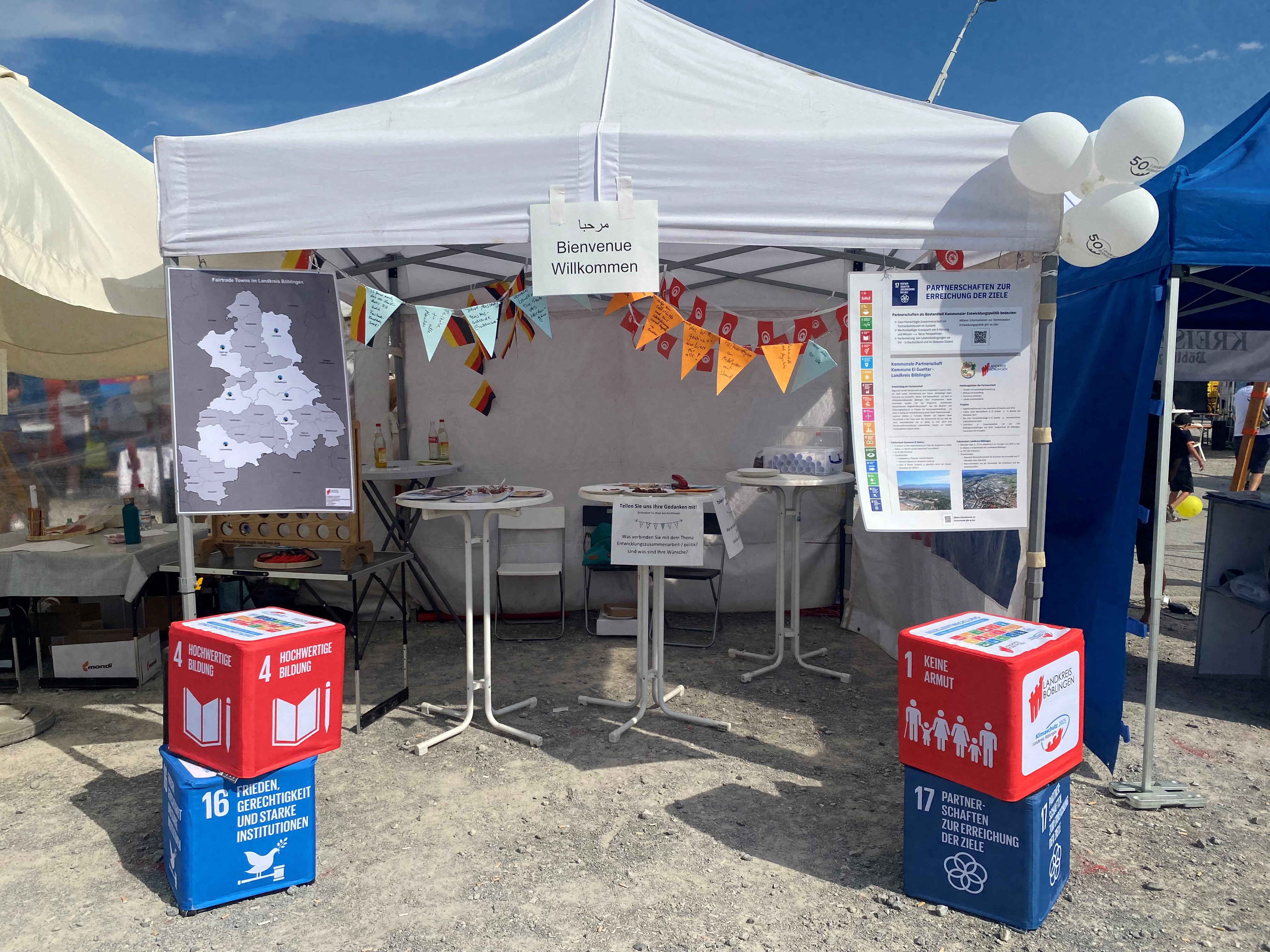 Partnerschaftliche Zusammenarbeit zwischen Kommunen im Globalen Süden und Globalen Norden, sind ein wichtiger Bestandteil Kommunaler Entwicklungspolitik. Im Jahr 2016 ist der Abfallwirtschaftsbetrieb eine Projektpartnerschaft mit der Stadt El Guttar in Tunesien eingegangen. Nach vielen gemeinsamen erfolgreichen Projekten bestand der Wunsch auf beiden Seiten die Partnerschaft zu erweitern. Im Jahr 2019 wurde daher eine Partnerschaftsvereinbarung unterzeichnet. Nur untermittelbar danach kam dann die Corona Pandemie auf, was zur Folge hatte, dass gemeinsame Aktivitäten nur eingeschränkt möglich waren. Inzwischen konnte die Partnerschaftsarbeit wieder aktiv aufgenommen werden. Zum 50- jährigen Kreisjubiläum reiste am 09. Juli eine Delegation aus El Guettar in den Landkreis. Um die Partnerschaft mit der tunesischen Kommune auch bei den Bürgerinnen und Bürgern im Landkreis weiter bekannt zu machen und um Interessierte zu erreichen, die sich vorstellen können an der Partnerschaft mitzuwirken, gab es beim Bürgerfest einen gemeinsamen Partnerschaftsstand. In einem Arbeitstreffen wurde über die Partnerschaftsarbeit gesprochen und weitere Projektideen entwickelt, um die Partnerschaft zu stärken.