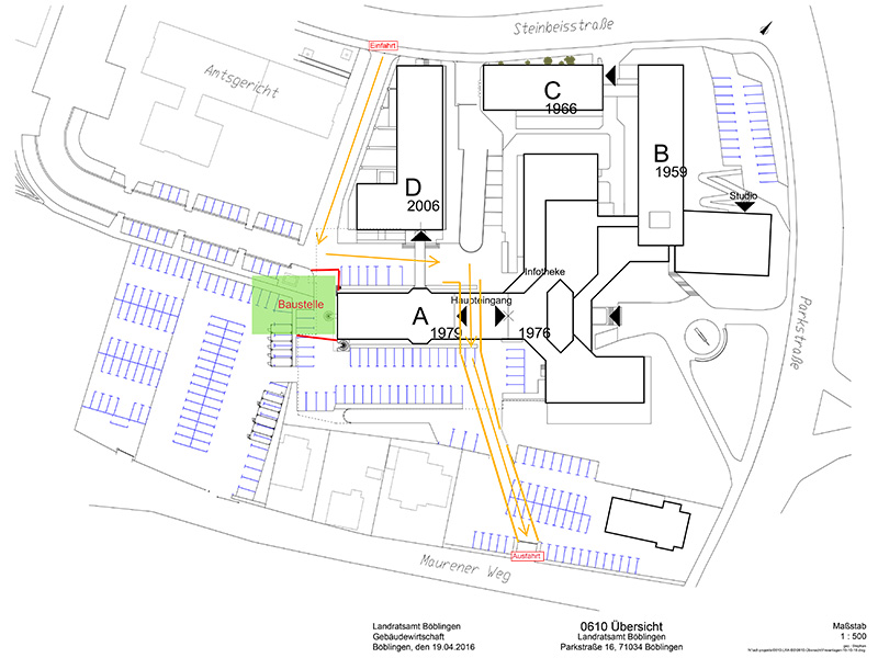 Der Autoverkehr wird mit einer Einbahnstraßenregelung zwischen dem Haupteingang und dem gegenüber liegenden Eingang (zum Amt für Prüfung und Kommunalaufsicht, zur Beratungsstelle des Versorgungsamtes und der Beauftragten für Menschen mit Behinderung) umgeleitet. In diesem Bereich kommt es daher zu einem erhöhten Verkehrsaufkommen und zu verkehrsbedingten Einschränkung. Wir bitten alle Besucher um besondere Vorsicht.
