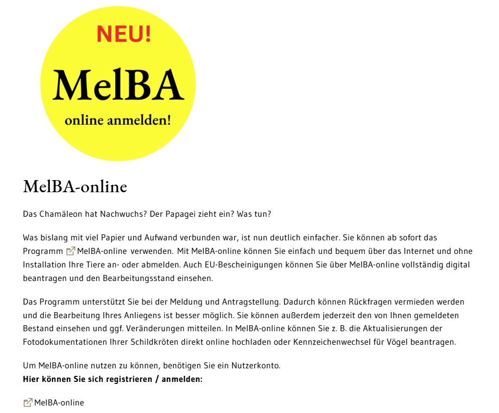 Über das Online-Portal „Melde– und Bescheinigungswesen im Artenschutz“ (MelBA-online) können die erforderlichen Angaben gemacht werden.