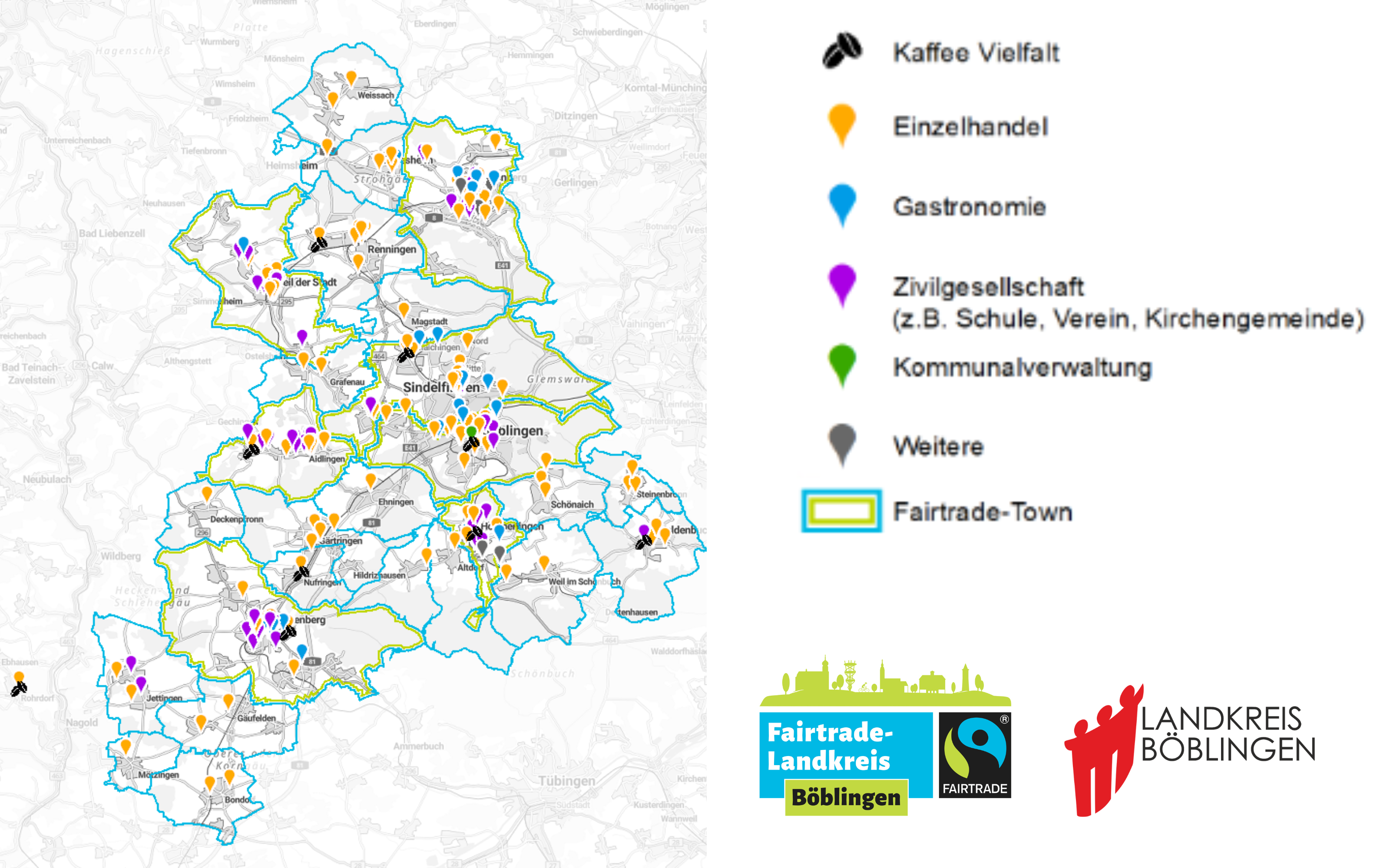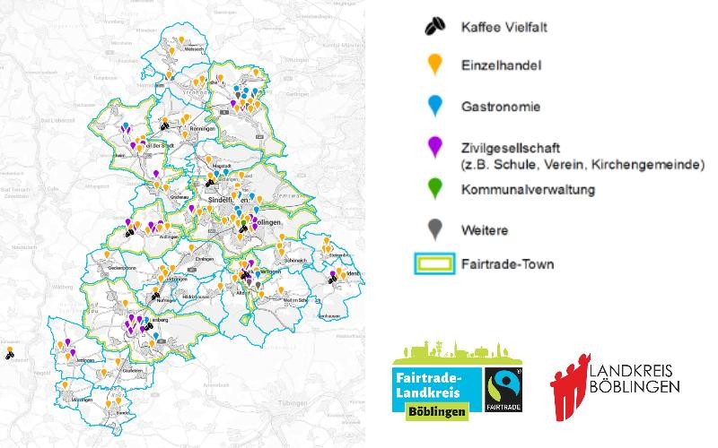 Auf der Karte finden Nutzerinnen und Nutzer Gastronomiebetriebe, die fair gehandelte Produkte auf ihren Speisekarten führen, eine Vielzahl von Einzelhandelsgeschäften mit fairem Sortiment sowie zivilgesellschaftliche Initiativen, die sich durch Bildungs- und Aufklärungsarbeit für faire Lieferketten und globale Gerechtigkeit starkmachen. Auch die bisher sieben Fairtrade-Towns im Kreis Aidlingen, Böblingen, Herrenberg, Holzgerlingen, Leonberg, Sindelfingen sowie Weil der Stadt sind dabei prominent vertreten.