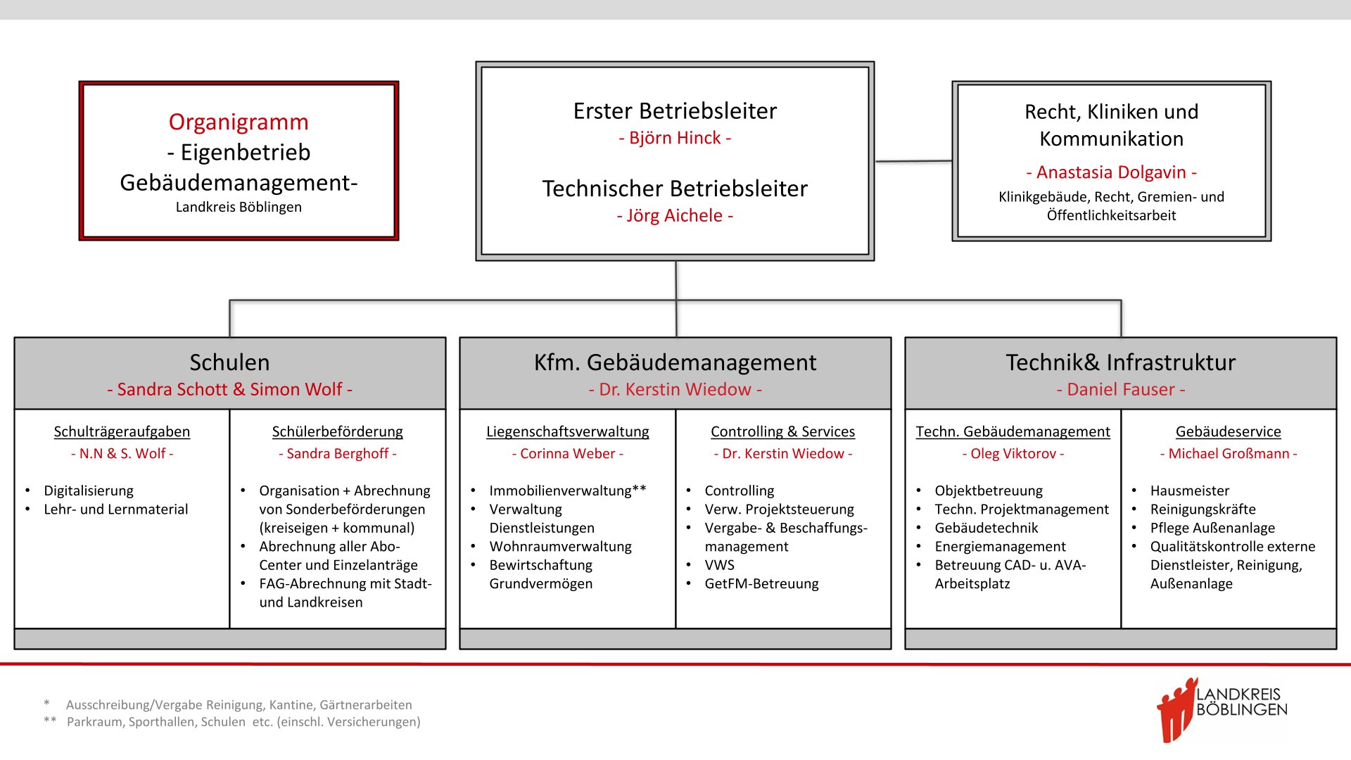 Als Betriebsleitung für den Eigenbetrieb „Gebäudemanagement Landkreis Böblingen“ wurden der Dezernent für Steuerung und Service Herr Björn Hinck und der Leiter der Gebäudewirtschaft Herr Jörg Aichele bestellt. Die Funktion der Ersten Betriebsleitung und des kaufmännischen Betriebsleiters wird von dem Dezernenten für Steuerung und Service Herrn Björn Hinck im Nebenamt übernommen. Die Funktion des technischen Betriebsleiters wird vom Leiter der Gebäudewirtschaft Herr Jörg Aichele im Hauptamt übernommen.